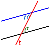 - Если прямая пересекает одну из параллельных прямых, то она пересекает и другую (такая прямая называется секущей). При этом образуется 8 углов, некоторые характерные пары которых имеют особые названия и свойства: