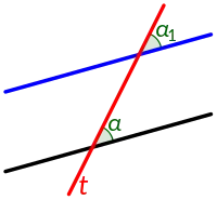 | Рис.1: Соответственные углы равны, . | Рис.2: Внутренние накрест лежащие углы равны, . | Рис.3: Односторонние углы являются дополнительными, . |