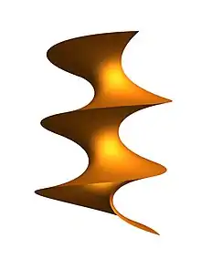 В экстремальных точках поверхность является катеноидом или геликоидом . В остальном представляет угол совмещения. Результирующая поверхность, при выборе области определения во избежание самопересечений, представляет собой цепочку, вращающуюся вокруг оси по спирали.