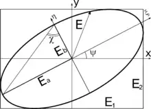 Здесь и — большая и малая полуоси поляризационного эллипса, — угол поворота поляризационного эллипса относительно произвольной лабораторной системы координат — носит название азимута эллиптически-поляризованного излучения[3] (или кратко — азимут), а угол , определяемый из условия отношения малой полуоси к большой — угол эллиптичности эллипса поляризации. Нетрудно заметить, что , и являются проекциями на некие координатные оси. В итоге независимыми являются всего три параметра Стокса, поскольку: