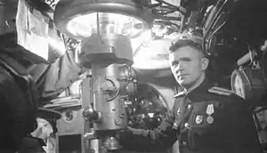 ![]() Командир советской подводной лодки Щ-201 капитан-лейтенант Павел Иванович Парамошкин в центральном посту | |