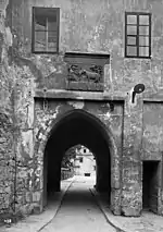Из города в замок можно попасть только через один вход: на главной широкой улице города со стороны площади к замку прилегает крепостная стена, продолжающаяся до живописного трёхугольного барбакана (т. н. «Пршиградека» — чеш. Příhrádek), первоначально связанного с замком длинным деревянным мостом. Только после прохождения вторых ворот Пршиградека, охраняемых квадратной башней, можно пройти внутрь замковых укреплений. Через год после большого наводнения 1804 года вместо деревянного моста была сооружена земляная дамба из наносов с каменным мостом посредине. Над каналом, через который сквозь дамбу в замковый ров поступала вода, были возведены две статуи святых — Яна Непомуцкого и Франциска из Паолы[4][12].