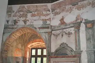 Сохранившийся входной замковый портал, высеченный в 1529—1538 годах и установленный в 1541 году (даты указаны на самом портале), соединён с внешним двором рельефно украшенным каменным мостом, перекинутым через небольшой внутренний ров (строительство моста было окончено в 1543 году). В интерьере замка особого внимания заслуживают рыцарские залы с фресками в стиле эпохи Возрождения, принадлежащими к старейшим сохранившимся в Чехии ренессансным настенным росписям. Особо ценными являются два сохранившихся в первоначальном виде кессонных потолка, расписанных в раннеренессансном стиле[4][12].