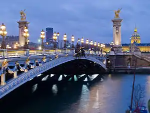 Наиболее элегантным и известным мостом прекрасной эпохи является мост Александра-III, построенный по проекту архитекторов Йозефа Касьян-Бернара и Гастона Кузен, и инженерами Жан Résal и Амедом д’Alby. Мост был предназначен для перехода с одной выстави на другую в 1900 году. Первый камень в мост в октябре 1896 года заложил Николай II, будучи цесаревичем. Мост в сочетании с современными инженерными решениями имел длину 107 метров и классическую изящную архитектуру. Противовесами для обслуживания моста стали четыре массивные каменные колонн высотой в семнадцать метров. На колоннах размещены скульптуры, представляющие науку, искусство, торговлю и промышленность. В центре, по бокам моста, находятся скульптуры двух групп Речных нимф — нимфы Сены с одной стороны, нимфы Невы на другой. Подобный Троицкий мост, по проекту Гюстава Эйфеля, был перекинут через Неву в российской столице Санкт-Петербург в 1897 году[8].