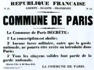 Парижская коммуна (фр. Commune de Paris) — революционное правительство Парижа во время событий 1871 года, когда вскоре после заключения перемирия с Пруссией во время Франко-прусской войны в Париже начались волнения, вылившиеся в революцию и установление самоуправления, длившегося 72 дня (с 18 марта по 28 мая). Во главе Парижской коммуны стояли объединённые в коалицию неоякобинцы, социалисты и анархисты. Уже 26 марта прошли выборы в Парижскую коммуну.