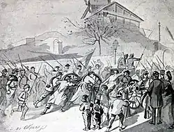 15 марта Тьер прибыл в Париж и приказал овладеть пушками национальной гвардии, которые собраны были на высотах Монмартра и охранялись весьма слабым караулом. Движение войска на Монмартр, произведённое на рассвете 18 марта, удалось. Изначально республиканская гвардия, возглавляемая дивизионным генералом Леконтом, отбросила силы национальной гвардии. Однако нацгвардейцы объединили свои подразделения и окружили республиканскую гвардию; но для того, чтобы увезти пушки, не захватили с собой упряжи и лошадей. Пока войска дожидались упряжи, собралась национальная гвардия. Республиканскую гвардию разоружила толпа гражданских, которым они не оказали сопротивление. Солдаты побратались с гвардейцами и арестовали своих высших начальников; генерал Леконт, отдавший приказ стрелять в толпу, был сначала заключён в тюрьму Шато-Руж, а затем расстрелян своими солдатами, та же участь постигла и генерала Клемента Тома, который изначально скрылся в гражданском, оказавшегося поблизости. Тома арестовали в два часа дня, затем переправили в Шато-Руж. Позже одиннадцать департаментов Парижа последовали примеру Монмартра.
