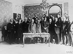 ![]() Фрагмент картины «Подписание мира в Зеркальном зале». Изображено подписание Версальского договора. | |