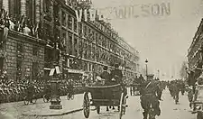Приём Вильсона в Париже был ещё более триумфальным. Премьер-министр Клемансо прибыл на вокзал вместе со своим правительством и давним политическим противником, президентом Пуанкаре. После этого американский президент и его жена проехали до своей новой резиденции в открытой карете через площадь Согласия и по Елисейским полям; сам Вильсон остался очень доволен таким приёмом[18].