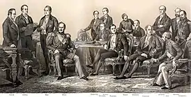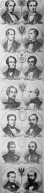 - Франция — председательствовал на заседаниях французский министр иностранных дел, двоюродный брат императора Наполеона III и внебрачный сын Наполеона I — граф Александр Валевский. Второй участник Франсуа-Адольф де Буркене — посол Франции в Австрии.