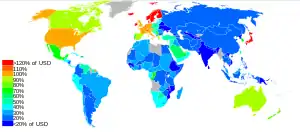 Уровень цен в экономике США принят за базовый, поэтому для США он равен 100. Как видно из рисунка «Сопоставимый уровень цен по странам мира в 2003 году», размещенного в начале статьи, существует некая зависимость между ВВП по ППС и сопоставимым уровнем цен (чем больший ВВП по ППС, тем выше сопоставимый уровень цен). Бермуды имеют самый высокий уровень цен, 154, поэтому товары, продаваемые на Бермудах, на 54 % дороже, чем в США.