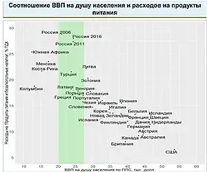 По данным Федеральной службы государственной статистики РФ, паритет покупательной способности рубля к доллару в 2002 году составлял 9,27 рубля на один доллар США. А ВВП, по данным всё той же службы, на 2002 год (на душу населения, по паритету покупательной способности в долларах США) составлял 8087, что являлось 38-м показателем в мире и составляло 22 % от того же показателя в США.