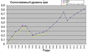 В начале 1990-х годов в России расхождение между номинальным курсом валют и паритетным значением было очень велико: сопоставимый уровень цен в 1992 году составлял всего 7,3 % (Россия была очень дешёвой страной).[12] Но уже к 1996 году сопоставимый уровень цен достиг 42-43 %.[12][13]