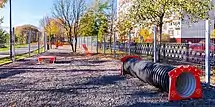 В 2018—2019 годах существующие детские площадки отремонтировали, а также организовали новые. В западной и восточной частях парка для детей есть несколько развлекательных зон. Основное игровое пространство размером более 1000 м 2 расположено в юго-восточной части[17]. Оно находится рядом с ЖК «Синяя птица» и футбольным полем. Здесь размещены городки в форме самолета и автобуса с канатными сетями для лазания и горками. Рядом также расположена детская площадка в форме крокодила и трехуровневый игровой комплекс с внешней горкой. На территории обустроен комплекс в форме кубов, защищенных металлической сеткой и оборудованных горками. Помимо этого, есть небольшая площадка с музыкальными инструментами. Рядом с модульным памп-треком у водоема находится большая сетка для лазания.