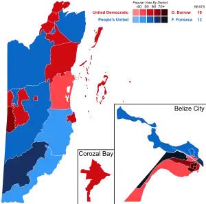 | Результат выборов | Объединённая демократическая партия получила большинство в Палаты представителей Белиза. Дин Барроу вновь стал премьер-министром. | ||