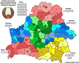 23 сентября 2012 года состоялись выборы депутатов Палаты представителей Национального собрания Республики Беларусь 5 созыва (белор. Выбары дэпутатаў Палаты прадстаўнікоў Нацыянальнага сходу Рэспублікі Беларусь), на которых избиралось 110 депутатов по одномандатным округам. 109 депутатов были избраны в первом туре, в Новобелицком округе Гомеля выборы не состоялись. По предварительным данным, явка составила 74,2 % (от 59,2 % в Минске до 80,7 % в Витебской области)[1], хотя независимые наблюдатели заявили о том, что на ряде участков выборы не состоялись из-за низкой явки (см. ниже). Большинство оппозиционных партий бойкотировали выборы, а ни один из принявших участие независимых политиков избран не был (см. ниже). Наблюдатели от ОБСЕ указали на улучшение организации процесса голосования, но отметили сохранение практики произвольной трактовки избирательного законодательства и пристрастность центральных СМИ и Центризбиркома, а также указали на ухудшение прозрачности подсчёта голосов; наблюдатели от СНГ сочли выборы прозрачными и открытыми (см. ниже).