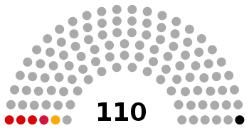 | Прошлые выборы | 6 / 110 (4,27 %) | 3 / 110 (0,42 %) | 0 / 110 (0,60 %) |