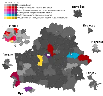 | Партия | Коммунистическая партия Беларуси | Республиканская партия труда и справедливости | Белорусская патриотическая партия |