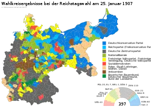 Федеральные выборы были проведены в Германии 25 января 1907 года[1]. Социал-демократическая партия (СДПГ) набрала наибольшее число голосов, но получила лишь 43 депутатских мандата из-за меньшей численности избирателей в сельских округах по сравнению с городскими[2]. Партия Центра, получив 105 из 397 мест, осталась крупнейшей партией в рейхстаге[3]. Явка избирателей составила 84,7%[4].