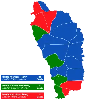| Результат выборов | Объединённая рабочая партия получила большинство мест парламента. Эдисон Джеймс стал премьер-министром Доминики. | ||