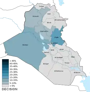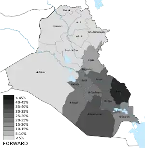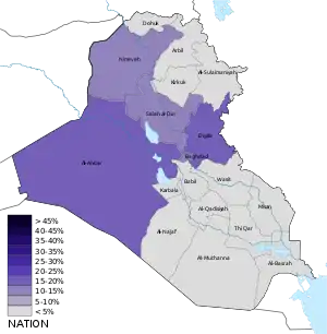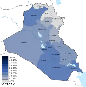 | Провинции | Альянс Победы | Право закона | Альянс революционеров за реформы | Фатх | Ирада | Национальное движение | Муттахидун | Аль-Арабия | Нацдвижение за реформы | Аль-Ватания | Гражданский альянс | КДП | ПСК | Коалиция за демократию и свободу | Новое поколение | Горран | Курдистанская исламская группа | КИУ | Всего |