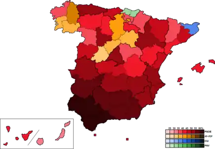 | Результат выборов | Победу одержала Испанская социалистическая рабочая партия, получив 57,71 % мест в Конгрессе депутатов | ||