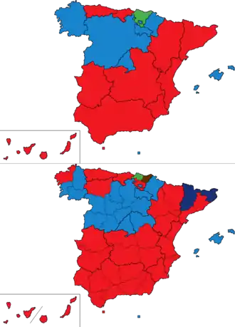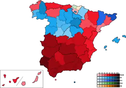 Социалисты победили в 30 провинциях, а также в Сеуте. Народная партия выиграла выборы в 16 провинциях, в том числе Мадриде, а также в Мелилье. «Конвергенция и Союз» занял первое место в Жироне и Льейде. Баскские националисты первенствовали в Бискайе, а «Народное единство» в Гипускоа.