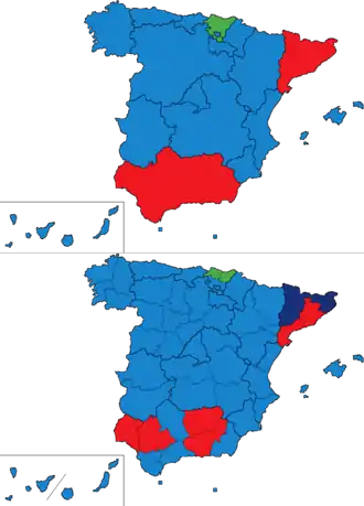 | Кастилия-Леон | 55,7 | 22 | 32,2 | 11 | 4,4 | 0 | — | — | — | — | 2,6[~ 15] | 0 | 33 |