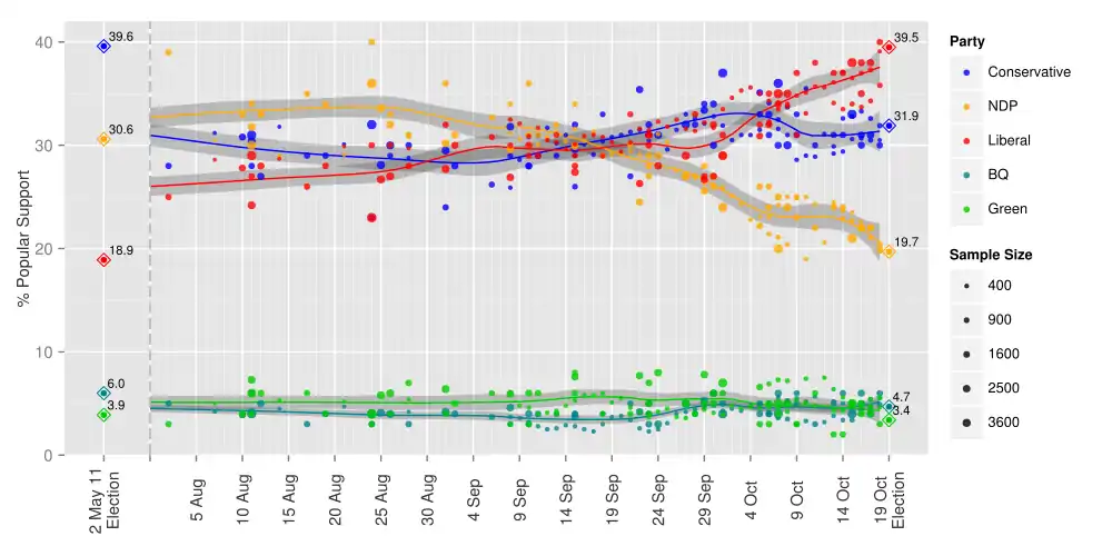 За неделю до выборов опрос, проведённый организацией Forum Research показал, что у либералов было 37% поддержки, в то время как у консерваторов – 31%, у НДП – 24%, Квебекского блока – 6% и Партии зелёных – 2%. При этом 26% респондентов поддерживали ЛП, так как считали, что у неё больше шансов возглавить правительство[4].
