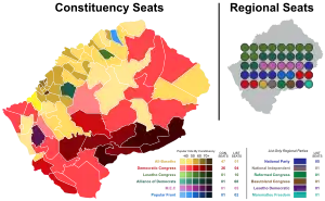 Национальное собрание Лесото состоит из 120 депутатов, избираемых по смешанной избирательной системе. Из них 80 депутатов избираются в одномандатных избирательных округах, остальные 40 — по единому национальному округу по партийным спискам[5].