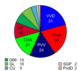 | Народная партия за свободу и демократию | ![]() | Марк Рютте | 14,7 %, 22 места | 24,0 %, 37 мест (25.05) 24,8 %, 38 мест (28.05) 24,6 %, 38 мест (01.06) 23,0 %, 36 мест (04.06) 21,7 %, 33 места (08.06) | 37 мест | 37 мест | |