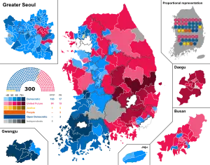 «Демократическая партия» и её сателлит «Платформенная партия» одержали убедительную победу, получив 180 из 300 мест (60%) в сумме. Только «Демократическая партия» получила 163 места, что является самым высоким показателем для партии с 1960 года. Это гарантирует правящему либеральному альянсу абсолютное большинство в законодательной палате и три пятых супербольшинства, необходимое для ускорения процедур. Консервативный альянс между «Объединённой партией будущего» и ее сателлитом «Партией будущего Кореи» получил только 103 места, что является худшим результатом для консерваторов с 1960 года[2].