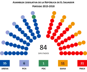 ![]() Распределение мест парламента: Националистический республиканский альянс: 35 мест Фронт национального освобождения имени Фарабундо Марти: 31 место Широкий альянс за национальное единство: 11 мест Национальная коалиционная партия: 6 мест Христианско-демократическая партия: 1 место | |||