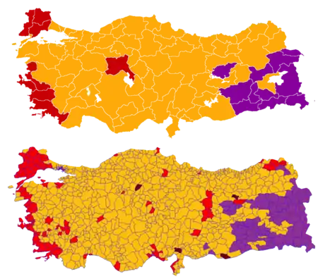 ![]() Победители по провинциям и избирательным округам Турции: ПСР РНП ДПН ПНД | |||