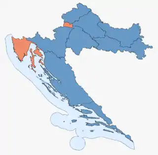 ![]() Результаты выборов в каждом из десяти избирательных округов Хорватии: партия с большинством голосов в каждом избирательном округе HDZ: синий; SDP: красный | |||