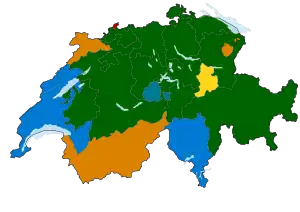 ■ – FDP/PLR ■ – SPS/PSS ■ – BDP/PBD ■ – CSP OW Результаты выборов по избирательным округам. | |||