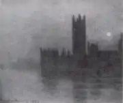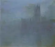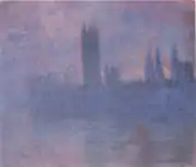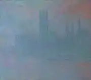 | Парламент, эффект тумана, фр. Le Parlement, effet de brouillard. 81,3 × 92,4 см. Слева внизу подпись и дата: Claude Monet 1903. Метрополитен-музей, Нью-Йорк, США. Инв. № 56.135.6[26]. | В июле 1909 года выкуплена у Моне Полем галереей «Бернхайм-Жён» и 24 марта 1911 года продана в галерею Поля Дюран-Рюэля, который уже 24 мая перепродал её Артуру Б. Эммонсу из Ньюпорта, США. В 1922 году унаследована его вдовой Джулией Б. Эммонс и в 1956 году по её завещанию картина была передана в Метрополитен-музей[27]. |