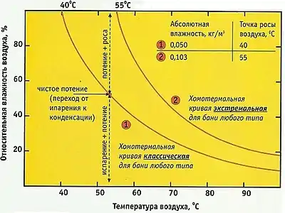 Микроклимат парных бань определяется не только температурой воздуха, но и влажностью воздуха, которая затрудняет испарение воды с мокрой кожи и уменьшает охлаждение тела человека на воздухе. Возможность испарения воды (с сушкой кожи) прекращается при точке росы воздуха, равной температуре кожи (сохраняющейся в бане на уровне примерно 40oC неизменной вследствие гомеостаза человека). Это соответствует абсолютной влажности воздуха порядка 50 г/м3. В координатах «температура-относительная влажность воздуха» (характерных для бытовых метеостанций) такая абсолютная влажность воздуха отвечает метеорежимам (метеоточкам, метеопараметрам, метеоусловиям), изображаемым графически в виде так называемой «хомотермальной кривой» (от лат. «хомо» - человек, «терма» - тепло)[14].