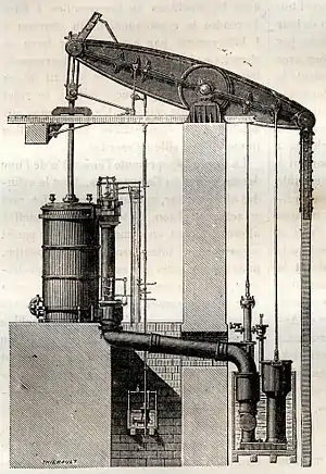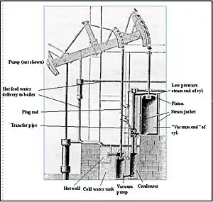 Поршень связан цепью с концом большого коромысла, вращающегося вокруг своей середины. Насос под нагрузкой связан цепью с противоположным концом коромысла, которое под действием насоса возвращает поршень к верхней части цилиндра силой гравитации. Так происходит обратный ход. Давление пара низкое и не может противодействовать движению поршня[9].