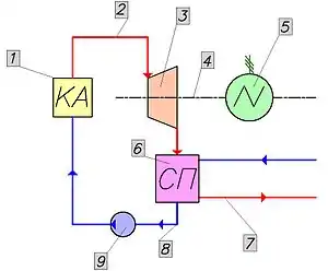Схема работы теплофикационной турбины: Свежий (острый) пар из котельного агрегата (1) по паропроводу (2) направляется на рабочие лопатки цилиндра высокого давления (ЦВД) паровой турбины (3). При расширении, кинетическая энергия пара преобразуется в механическую энергию вращения ротора турбины, который соединен с валом (4) электрического генератора (5). В процессе расширения пара из цилиндров среднего давления производятся теплофикационные отборы и из них пар направляется в подогреватели (6) сетевой воды (7). Отработанный пар из последней ступени попадает в конденсатор, где и происходит его конденсация, а затем по трубопроводу (8) направляется обратно в котельный агрегат при помощи насоса (9). Бо́льшая часть тепла, полученного в котле используется для подогрева сетевой воды.