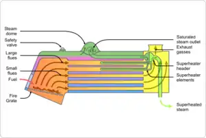 Часто в цилиндрической части находится и пароперегреватель, который размещён в трубах, которые в основном аналогичны дымогарным, но больше диаметром. Такие трубы называют уже жаровыми, а сам пароперегреватель — жаротрубным.