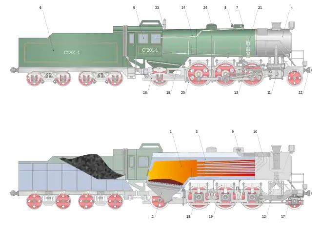 Несмотря на разнообразие конструкций, все паровозы имеют три основные взаимосвязанные части: паровой котёл, паровая машина и экипаж[4][5].