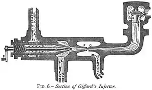 Классический инжектор состоит из трёх частей — сопла, смесителя (конфузора) и диффузора. В начале работы, когда начинают подачу пара, происходит его конденсация на холодных стенках аппарата. При этом в полости инжектора создается разрежение, благодаря чему вода из резервуара поднимается и наполняет инжектор. Далее постепенно увеличивают подачу пара. Расширяясь внутри корпуса прибора, пар приобретает большую скорость, увлекая за собой воду. При этом образуется смесь питательной воды и сконденсировавшегося пара, которая с большой скоростью попадает в расширяющийся конус. В конусе скорость смеси преобразуется в необходимое давление и она, преодолев сопротивление клапана, попадает в котёл.