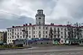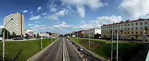 ![]() Вид на Партизанский проспект возле станции метро Партизанская во время ремонта дороги. Видны гостиница «Турист», универмаг «Беларусь», администрация Заводского района | |