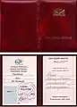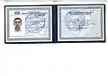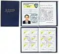 ![]() Обложка, первый и второй разворот партийного билета правящей в СССР партии КПСС: Ф. И. О., №, фото, графа об уплате членских взносов. Образец (1973—1991 годы). | |