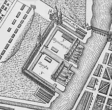 Первые деревянные здания Партикулярной верфи были построены в 1715—1722 годах архитекторами Г. Маттарнови, Н. Ф. Гербелем и Д. Трезини. Верфь имела обводный и внутренний каналы, прорытые в 1718 году. Вдоль современной Гагаринской улицы находились казармы судовых плотников и солдат морского ведомства. На территории Партикулярной верфи располагались также построенные по проекту Трезини контора и аптека (1716) и каменная смоляная баня (1719). Верфь также имела каменные ворота с башней и шпилем, склады, стапели, лесопилку, три деревянных моста. В 1743 году деревянные здания Партикулярной верфи заменены каменными архитекторами И. К. Коробовым, И. Я. Шумахером и М. А. Башмаковым.