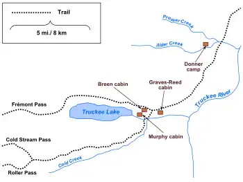 Начал идти снег. Семья Брин наткнулась на 300-метровый «массивный, почти вертикальный склон» у озера Траки, и оказавшись в 3 милях от вершины, устроила лагерь у избы, построенной двумя годами ранее другой группой пионеров. Хижины были построены тремя членами из другой группы эмигрантов, получившей название партии Стивенса, а именно Джозефом Фостером, Алленом Стивенсом и Мозесом Шалленбергером в ноябре 1844 г.[48]. Позднее Вирджиния Рид вышла замуж за члена этой группы Джона Мёрфи, не имевшего ничего общего с семьей Мёрфи, находившейся в составе группы Доннера[49]. К ним присоединились семья Эдди и Кесеберги — попытавшись пройти на перевал, они попали в сугробы до 3 метров высотой и не смогли найти тропу. Они вернулись обратно к озеру Траки и, в течение дня, здесь остановились все семьи, кроме Доннеров, которые были позади них на расстоянии 8 километров — полдня пути. В последующие несколько дней были предприняты ещё попытки пробиться к перевалу вместе с повозками и животными, но все усилия были тщетны.