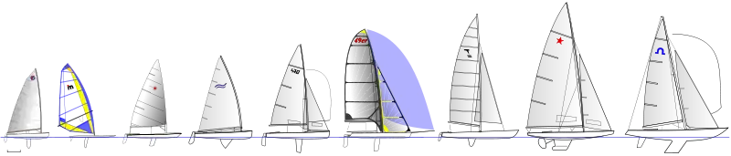 Слева-направо: швертбот "Европа", парусная доска "Мистраль", швертбот "Лазер", швертбот «Финн», швертбот «470», швертбот «49-й», катамаран «Торнадо», килевая яхта «Звёздный», килевая яхта «Солинг»