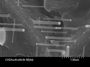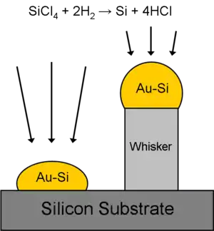 - Посредством процесса физического осаждения из газообразной фазы, либо химического процесса, катализированного каплей жидкого металлического расплава, в системе вакуумного осаждения осуществляется рост одномерных кристаллических нанонитей. Капли Au-Si на поверхности подложки снижают энергию активации нормального роста при процессе пар-кристалл. Например, осаждение Si при помощи реакции газовой смеси SiCl4:H2 (химическое осаждение из газообразной фазы) в нормальном процессе пар-кристалл возможно только при температурах выше 800 °C. Более того, при меньших температурах Si практически не осаждается на поверхность подложки. Однако, частицы Au могут сформировать капли эвтектики Au-Si при температурах выше 363 °Си поглощать Si из газообразной фазы (вследствие того, что Au может формировать твёрдые растворы с любой концентрацией Si вплоть до 100 %) пока не наступит пересыщенные состояние Si в Au. Более того, наноразмерные капли Au-Si имеют куда меньшие температуры плавления вследствие того, что соотношение площади поверхности к объёму увеличивается, что становится энергетически невыгодным, поэтому наноразмерные частицы минимизируют свою поверхностную энергию, формируя капли (сферические или полусферические).