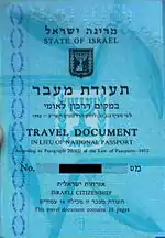 - ивр. תעודת מעבר במקום דרכון לאומי (Теуда́т ма’ава́р бимко́м дарко́н леуми́) или сокращённо ивр. תעודת מעבר (Теуда́т ма’ава́р)