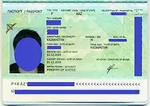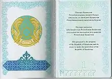 ![]() Лицевая сторона обложки биометрического паспорта гражданина Казахстана | |